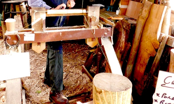 The Polelathe or shave horse will be used to make three legs. Then, using a rustic seat, a stool will be constructed to take home.